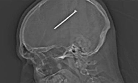 Si vous avez lu mon infographie #1, vous devez avoir compris qu’on pouvait avoir de la douleur sans dommage. Il est fréquent également de voir des dommages sans douleur, c’est le cas par exemple des signes d’imagerie dont j’ai déjà un peu parlé ici même si on peut les interpréter comme des cicatrices ou des rides plus que comme des dommages. Il y a également beaucoup d’histoires de gros dégâts sans douleur. L’histoire de Dante Autullo en est un exemple parmi beaucoup d’autres. Cet homme avait mal tiré avec son pistolet a clou et s’est retrouvé blessé à la tête. Il pensait que c’était une égratignure et n’a accepté d’aller à l’hôpital que le lendemain matin parce qu’il se sentait nauséeux. Il avait en fait un clou dans le cerveau.