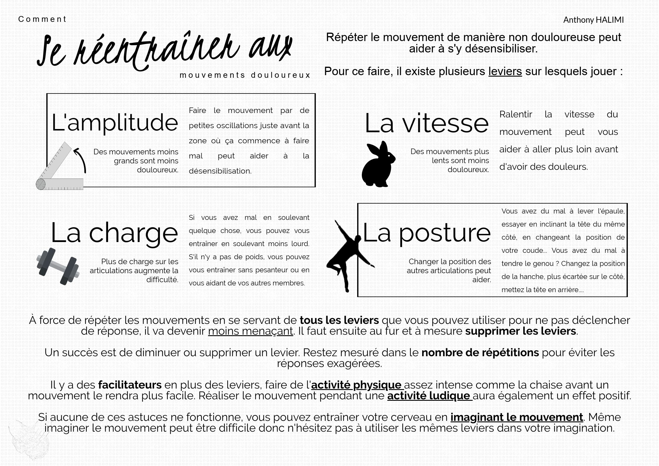 C’est une notion importante que je n’ai découvert qu’après le diplôme et pourtant si utile que j’aurais vraiment aimé l’apprendre plus tôt. Le mouvement permet de diminuer les douleurs. Un patient qui a mal quand il tend le genou pourra tirer des bénéfices de l’extension de genou répétée7. Il y a plusieurs modalités qu’on peut influencer pour aider à atteindre cette antalgie. Maitland propose de faire varier l’amplitude de mouvement et la vitesse et Mulligan d’y ajouter des glissements.